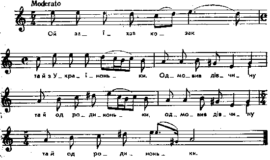 Ой заїхав козак та й з Україноньки, одмовив дівчину та й од родиноньки. (2) – Ой поїдь, дівчино, ой поїдь із нами, ліпше ж тобі буде, як у твеї мами. (2) У мами ходила в подраній свитині, в нас будеш ходити в чорній кармазині. (2) Ой дурна дівчина, дурна послухала, сіла з козаченьком, сіла, поїхала. (2) Ой завіз дівчину під густий лісочок: – Ой скидай, дівчино, з голови віночок! (2) Ой плаче дівчина, плаче-умліває, з головки віночок, з головки скидає. (2) Ой завіз дівчину на жовті пісочки. – Ой скидай, дівко, з головки биндочки! (2) Ой плаче дівчина, плаче-умліває, з головки биндочки, з головки скидає. (2) Ой узяв дівчину під білії боки та й кинув дівчину у Дунай глибокий. (2) Ой плаче дівчина, плаче-умлівае, за берег ручками, за берег хватає. (2) Ой то козаченько шабельку виймає та й по лікоть ручки дівчині втинає. (2) Як забачив братик з високого муру, спустився до сестри на шовковім шнуру. (2) Ой десь ти, сестро, розкоші не мала, що ти гайдамаці на підмогу стала! (2) – Ой мала ж бо я розкоші доволі, тільки ж я не знала, що то в світі горе! (2) Дуже близький, але повніший і консеквентніший польський варіант у Gloger, № 102, s. 212. Мелодія там банальна і не подібна до цієї, розмір – 3/4. Цезар Нейман в Zbiorze wiadomości do antropologii krajowej, t. VIII, на с. 174, дав коротеньку розвідку про цю баладу, де через польські і чеські варіанти проводить її до зв’язку з бретонською легендою о Синій Бороді. Обширний перегляд варіантів укр., білоруських і польських у Довнар-Запольский, під № 555 і додаток 3, № 22. Мелодій, подібних до поданої тут, мені ніде в друку не трапилося; в моїх рукописних матеріалах є дуже близький варіант її з Радомиського пов., Київської губ. Той варіант має сталу збільшену секунду с – dis (обсяг е1 – fis2) і ще більш, ніж цей, розходиться з характером польської людової мелодії, що в зв’язку з незвичайною літературною близькістю до польської балади становить інтересну загадку. Місце запису : Миропілля Звягельського повіту Примітки Джерело : Леся Українка. Зібрання творів у 12 тт. – К. : Наукова думка, 1977 р., т. 9, с. 269 – 270. Вперше опубліковано : Народні мелодії. З голосу Лесі Українки. Записав і упорядкував Климент Квітка. – К. : 1917 р., ч. 1, с. 88 – 89. Цій баладі К. Квітка присвятив окрему розвідку: «Українські пісні про дівчину, що помандрувала з зводителем» («Повідомлення Кабінету музичної етнографії», № 2. УАН. К., 1926). Фольклорні записи Перший | Попередній | Перелік | Наступний | Останній |