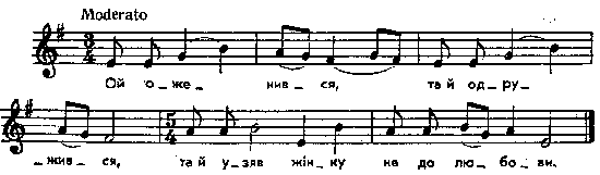 Ой оженився, та й одружився, та й узяв жінку не до любови. Не до любови, не до розмови, не до чорних брів, не до вірних слів. Ой купив корабель та за триста рубель, та за триста рубель ще й з полтиною, та за триста рубель ще й з полтиною, посадив милу ще й з дитиною. – Чей пливи, мила, та й негідниця, ти в мене була неробітниця! Чей хвиля іде, – корабель пливе, а мила сидить, як свіча горить. А мила сидить, як свіча горить, а дитиночка – як та зірочка. – Ой вернись, мила, голубко сива, ти ж мені, мила, вже й до любови. І до любови, і до розмови, і до чорних брів, і до вірних слів. – Не вернусь, милий, голубе сивий, ой бив ти мене та й нагайкою. Ой бив ти мене та й нагайкою, ой щоб я була та й хазяйкою. Ой бив ти мене та й дубиною, ой щоб я була господинею. Ой було тіло, як папір, біле, а тепер воно та й почорніло. Мелодії з близькою ритмічною будовою: Лисенко, І, 2. Кілька варіантів тексту у Гринченко, т. 3, під № 638; показані паралелі і інших видань; з упущених зазначу : Rokossowska, s. 200. Пізніше опублікований вар.: Эварницкий, № 335 і 336. Місце запису : Миропілля Звягельського повіту Примітки Джерело : Леся Українка. Зібрання творів у 12 тт. – К. : Наукова думка, 1977 р., т. 9, с. 270 – 271. Вперше опубліковано : Народні мелодії. З голосу Лесі Українки. Записав і упорядкував Климент Квітка. – К. : 1917 р., ч. 1, с. 90 – 91. Фольклорні записи Перший | Попередній | Перелік | Наступний | Останній |