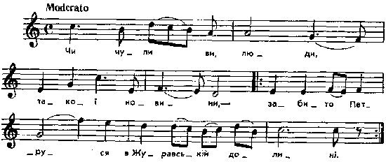 Чи чули ви, люди, такої новини, – забито Петруся в Журавській долині. (2) Пані пана мала, Петруся кохала, по чотири рази слуги посилала. (2) По чотири рази слуги посилала, а за п’ятим разом сама поїхала. (2) – Покидай, Петрусю, горох молотити, всядай до карити, будем разом жити. (2) – Пані моя, пані, не в такім я разі, пані ув атласі, а я хлоп в серм’язі. (2) – Не журись, Петрусю, не журись, серденько, зложу я свій атлас на тебе хутенько. (2) – Пані ж моя, пані, боюся напасти, щоби вельможному в руки не попасти. (2) – Не бійся, Петрусю, ти зо мною жити, поїхав вельможний до суду судити. (2) Слуги ж мої, слуги, слуги дорогії, будьте ж мені, слуги, на цей раз вірнії! (2) Слуги ж собі саме тоє дораджали, щонайвірнішого до пана послали. (2) Ой догнав він пана на кленовім мості. – Вернися, вельможний, має пані гості. (2) – Слуго ж моя, слуго, що тобі такого? Всяк же моя пані роду не такого! (2) – Ой пане мій, пане, коли мні не віриш, лучче з свого лука моє серце встрілиш! (2) Ох сиділа пані в новому оконі (sic), ой пізнала пана на воронім коні. (2) – Петрусю, серденько, утікай хутенько! Петрусь до порога – утікать немога. (2) Узяли Петруся під білії боки, вкинули Петруся у Дунай глибокий. (2) Молодая пані при тому стояла, кожному рибалці по таляру дала. (2) – Нате вам, рибалки, по півзолотого, витягніть Петруся хоча й неживого! (2) Сховали Петруся в Журавській границі, плакали дівчата, а ще й молодиці. (2) Та сама мелодія до інших слів: Бигдай, № 39. Подібні мелодії теж до інших слів – у Балліна, № 41; Роздольський, № 959; Остапович, т. 1, № 3. Парал. тексти з іншими мелодіями: Kolberg. Wolyn, № 536; Kolberg. Pokucie, t. 2, № 56; Лисенко, V, № 38; Колесса. Ходовичі, с. 290. Без нот: Гильтебрандт, 128 (Берестейського пов.); Чубинский, т. 5, № 128, с. 1017, № 204-206, с. 1068-1072; Головацкий, т. 1, 62 – 64; Kolberg. Pokucie, t. 2, № 57; Kolberg. Chelm, t. 2, № 1; Житецкий, с. 316 і 320; Новицкий, с. 107 – 109; Rokossowska, s. 171, № 11; Шухевич, т. 3, с. 187, № 3; Головацкий, т. 3, ч. 1, с. 14; Бессараба. Седлец, с. 113; Бессараба. Херсон, № 407 і 408. Див. іще вказання паралелей у Ів. Колесси; Waclaw z Oleska, s. 514, № 32. Місце запису : Луцький повіт Примітки Джерело : Леся Українка. Зібрання творів у 12 тт. – К. : Наукова думка, 1977 р., т. 9, с. 280 – 282. Вперше опубліковано : Народні мелодії. З голосу Лесі Українки. Записав і упорядкував Климент Квітка. – К. : 1917 р., ч. 1, с. 100 – 101. Запис цієї балади зроблено Лесею та її братом Михайлом (Державний центральний музей музичної культури ім. М. І. Глінки в Москві, ф. 275, інв. № 70, арк. 3 – 4), в якому відсутні, порівняно із записом Квітки, два перші і два останні рядки, розходження в текстах незначні. Фольклорні записи Перший | Попередній | Перелік | Наступний | Останній |