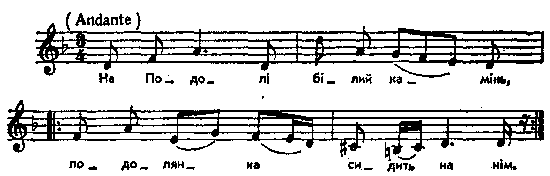На Подолі білий камінь, подолянка сидить на нім. Дальших слів пісні не записано, і по збірниках укр. пісень я не знайшов ні пісні з подібними початковими словами, ні варіанта мелодії. Я її завів у розділ балад через те, що в збірнику польських пісень Gloger зустрів баладу, що починається так само: «Na Podolu biały kamień, podolanka siedzi na nim». Тема: дівчина отруїла свого брата з намови жениха. Балада на цю тему широко розпросторена і серед українського народу, більшість варіантів у нас починається словами «Ой Сербине, Сербиночку, сватай мене, дівчиночку». В моїх неопублікованих матеріалах є мелодія до цеї укр. балади з Гадяцького повіту, якої ритмічна схема однакова із схемою колодяженської «На Подолі білий камінь». Мелодії польського варіанта у Глогера і українських – у Лисенка, VII, № 27, і Остапович, т. 1, № 1, не мають нічого спільного з колодяженською. Парал. тексти без нот: Бессараба. Херсон, № 268 і 269. Місце запису : с.Колодяжне Ковельського повіту Примітки Джерело : Леся Українка. Зібрання творів у 12 тт. – К. : Наукова думка, 1977 р., т. 9, с. 286. Вперше опубліковано : Народні мелодії. З голосу Лесі Українки. Записав і упорядкував Климент Квітка. – К. : 1917 р., ч. 1, с. 105. У примітці до цієї пісні Квітка пише, що завів її у розділ балад тому, що у збірнику Глогера зустрів баладу з подібним початком. До цього можна додати, що з таким початком вона побутує на Пряшівщині («Українські народні пісні Східної Словаччини», II. Пряшів. 1963, стор. 428), на Лемківщині (записана від переселенців з Горлицького р-ну), у Wojcicki, t. 1, s. 232, у зб. Кольберга («Pieśni ludu polskiego», с. 129, № 8), у зб. Лігензи і Стоїнського (Pieśni ludowe z Polskiego Slązka, II, № 3-A, В, С, Д, E). C. Чернік відзначає її споріднення з італійською піснею «Донна Ломбарда» (Див.: С. Чернік. Polska epika ludowa, І956, стор. 124). Квітка подав ще два варіанти цієї пісні, що на Україні відома під заголовком «Про сербина», – «Українські народні мелодії», К., 1922, № 282 і 298. Фольклорні записи Перший | Попередній | Перелік | Наступний | Останній |