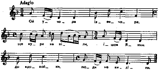 Ой учора ізвечора, ще кури не піли, ішов Яким до вдовойки, люди не виділи. Прийшов Яким до вдовойки: – Помагай-бі, серце! Вона йому одказує: – Забий жінку перше! – Не можу я, бідна вдово, милої забити, моя мила молодейка буде голосити. – Закрий комин, закрий двері, аби загоріла, набий її в головойку, – скажуть, що вдуріла. Прийшов Яким додомойку та й став жінку бити, – його жінка молодейка стала голосити. – Не жалуєш, Якимойку, мене, молодої, то пожалуй, Якимойку, дитини малої! Сусідойки, голубойки, дайте неньці знати, нехай іде свою дочку на смерть наряджати. – Ой що ж бо ти, моя доню, що ти завинила, що ти свою білу постіль так крівлею змила? – Як не знаю, моя мамо, нащо мня родила, так не знаю, моя мамо, що я завинила. Друга строфа, забута Лесею, доповнена мною з варіанта, записаного в Острозі в 50-х роках XIX віку Опанасом Марковичем. Див.: М. Драгоманов. Фатальная вдова. Уголовно-психологическая тема в укр. нар. песне. – «Киевская старина», 1888, XII (підпис: К. П.). Укр. переклад в «Розвідках М. Драгоманова про укр. нар. словесність», т. II. Львів, 1900. Паралелі: з іншою мелодією – Конощенко, т. 1, № 32; без нот – Гринченко, т. 3, № 651; у Грінченка показані паралелі з інших видань; крім тих – Kolberg. Pokucie, t. 2, № 313; Nejman, s. 133; Шухевич, т. 3, ст. 237, № 47; Эварницкий, № 287; Бессараба. Херсон, № 361; Гнедич, № 673; Головацкий, т. 3, ч. 1, с. 20, № 8; Waclaw z Oleska, s. 486, № 6. Місце запису : c.Колодяжне Ковельського повіту Примітки Джерело : Леся Українка. Зібрання творів у 12 тт. – К. : Наукова думка, 1977 р., т. 9, с. 294 – 295. Вперше опубліковано : Народні мелодії. З голосу Лесі Українки. Записав і упорядкував Климент Квітка. – К. : 1917 р., ч. 1, с. 114 – 115. Фольклорні записи Перший | Попередній | Перелік | Наступний | Останній |