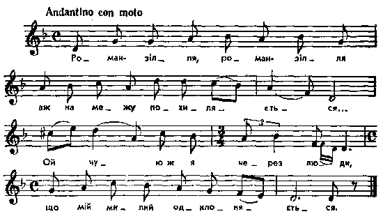 Роман-зілля, роман-зілля аж на межу похиляється... Ой чую ж я через люди, що мій милий одклоняється. Ой що ж мені по роману, – на роману ягідок нема. Ой що ж мені по поклону, коли його самого нема! . . . . . . . . . . . . . . . . . . . . . . . . . . Чи я ж тобі не казала, як стояла під повіткою: – Не їдь, не їдь у Крим по сіль. бо застанеш під наміткою. Чи я ж тобі не казала, як стояла під полицею: – Не їдь, не їдь у Крим по сіль, бо застанеш молодицею. – Любив тебе дівчиною, любитиму й молодицею, іще буду сім літ ждати, поки станеш удовицею. Варіанти мелодії: Лисенко, II, № 39; V, № 25; VII, № 16; Остапович, т. 2, № 14. Парал. тексти без нот: Гильтебрандт, 83 (Кобринського пов., Гроднен. губ.); Чубинский, т. 5, с. 4, № 6; с. 86, № 181; с. 202, № 409; Rokossowska, s. 281, № 167. Місце запису : Миропілля Звягельського повіту Примітки Джерело : Леся Українка. Зібрання творів у 12 тт. – К. : Наукова думка, 1977 р., т. 9, с. 302 – 303. Вперше опубліковано : Народні мелодії. З голосу Лесі Українки. Записав і упорядкував Климент Квітка. – К. : 1917 р., ч. 1, с. 122 – 123. Фольклорні записи Перший | Попередній | Перелік | Наступний | Останній |