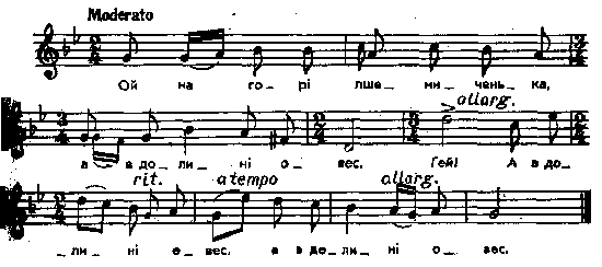 Ой на горі пшениченька, а в долині овес. Гей! А в долині овес, а в долині овес. Не по правді, мій миленький, ти зо мною живеш. Гей! Ти зо мною живеш, ти зо мною живеш. Що до теї нетіпанки та щовечора йдеш. Гей!.. А до мене, молодої, тай й у двір не зайдеш. Гей!.. – Ой посади, моя мила, У воротях вербу. Гей!.. Як буду йти од тіпанки, то й до тебе зайду. Гей!.. Ой вистели, моя мила, та й китайкою двір. Гей!.. Ой щоб же мій кінь вороний не помарав підків. Гей!.. – Бодай же ти, мій миленький, та й того не діждав, Гей!.. Ой щоб же твій кінь вороний та й китайку топтав. Гей!.. Ця мелодія була надрукована в виданні: Квітка; там через помилку склади «а в до-ли...» поставлені не під тими нотами, під якими треба. Ця помилка тут поправляється. Споріднені мелодії: Kolberg. Pokucie, t. 2, № 124; Роздольський, № 593 і 616 – 621; Радченко, № 124. Інші мел.: Конощенко, т. 1, № 9; т. 2, № 72 – 74; Лисенко, хор. III, № 6. Парал. тексти без нот: Метлинский, 67, 68; Чубинский, т. 5, с. 178, 396, 411; Довнар-Запольський, № 477. Милорадович, 116; Новицкий, 116; Эварницкий, № 216; Бессараба. Херсон, № 270 і 271; Гнедич, № 576; Waclaw z Oleska, s. 359, № 198. Місце запису : Миропілля Звягельського повіту Примітки Джерело : Леся Українка. Зібрання творів у 12 тт. – К. : Наукова думка, 1977 р., т. 9, с. 305 – 307. Вперше опубліковано : Народні мелодії. З голосу Лесі Українки. Записав і упорядкував Климент Квітка. – К. : 1917 р., ч. 1, с. 126. Фольклорні записи Перший | Попередній | Перелік | Наступний | Останній |