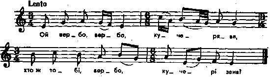 Ой вербо, вербо кучерява, хто ж тобі, вербо, кучері звив? Хто ж тобі, вербо, кучері звив, хто ж тобі, вербо, корінь підмив? Ізвнв кучері буйний вітер, підмила корінь бистра вода... А я, молода, як ягода, та не йшла заміж штири года. А пішла заміж аж п’ятого за п’яниченьку проклятого, що пропив коня вороного, йде до стаєнки по другого. А я, молода, проти нього несу червінця золотого. Несу червінця золотого – викупити коня вороного. Ой не раз, не два викупляла, вікном-дверима утікала. В зеленім саду ночувала, усіх пташечок вислухала. А соловейко як тьох, так тьох, котяться сльози, як той горох. А зозуленька – куку! куку! Ой за що ж таку терплю муку! Паралелі з близькими мелодіями: Гулак-Артемовський, № 27; Хведорович, № 3; Остапович, т. 2, № 13. З іншою мел.: Конощенко, т. 2; і без нот: Довнар-Запольский, № 402; Бессараба. Херсон, № 364; Гнедич, № 515. Місце запису : Миропілля Звягельського повіту Примітки Джерело : Леся Українка. Зібрання творів у 12 тт. – К. : Наукова думка, 1977 р., т. 9, с. 308 – 309. Вперше опубліковано : Народні мелодії. З голосу Лесі Українки. Записав і упорядкував Климент Квітка. – К. : 1917 р., ч. 1, с. 127 – 128. Фольклорні записи Перший | Попередній | Перелік | Наступний | Останній |