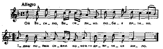 Ой Василю, Василино, любая дитино, їдеш полем сивим конем – дивитися мило. Далі слів Леся не пам’ятала. По збірниках ця строфа подибується в піснях різного змісту. З-поміж них з мелодіями іншими, ніж тут: Kolberg. Pokucie, t. 2, № 60; Колесса. Ходовичі, с. 277; Квітка, № 8. Без нот: Довнар-Запольский, № 500 (інтересний текст); Чубинский, т. 5, ст. 14; Гнатюк. Коломийки, № 581. Місце запису : Звягель [Новоград-Волинський] Примітки Джерело : Леся Українка. Зібрання творів у 12 тт. – К. : Наукова думка, 1977 р., т. 9, с. 309. Вперше опубліковано : Народні мелодії. З голосу Лесі Українки. Записав і упорядкував Климент Квітка. – К. : 1917 р., ч. 1, с. 128. Фольклорні записи Перший | Попередній | Перелік | Наступний | Останній |
