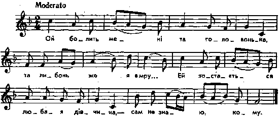 Ой болить мені та головонька, та либонь же я вмру... Ей, зостається любая дівчина, – сам не знаю, кому. Ей, як же тому та товаришу, – суди, боже, йому! Ей, як же тому та негідному, не дай, боже, йому! Місце запису : Миропілля Звягельського повіту Примітки Джерело : Леся Українка. Зібрання творів у 12 тт. – К. : Наукова думка, 1977 р., т. 9, с. 312. Вперше опубліковано : Народні мелодії. З голосу Лесі Українки. Записав і упорядкував Климент Квітка. – К. : 1918 р., ч. 2, с. 132. Фольклорні записи Перший | Попередній | Перелік | Наступний | Останній |