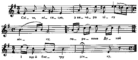 Світи, місяцю, з вечера цілу нічку, переплив Дунай іще й бистру річку. (2) Переплив Дунай і чобіток не помочив, – знати козака, що до дівчини ходив. (2) Куроньки піють, а я в дівчини сиджу, а прийду до доми, – сам себе ненавиджу. (2) Як прийду до доми, отець-матюнка лає, от отець лає, а ще й матюнка гірше. (2) Ой отець лає, а ще й матюнка гірше: – Синку, не ходи на вечорниці більше. (2) Не ходи, синку, на ті вечорниці, бо бог скарає за чужі молодиці. (2) – Ой за що мене, матінко, біг має карати? Я всядаю на коня, а вона просить до хати. (2) Ой годі, мати, та й на мене лаяти, я беру воли та й йду в поле орати. (2) Доорався козак до зеленого луга, – кидає воли й посеред поля плуга. (2) Кидає воли й посеред поля плуга, взяла козака йа за серденько туга. (2) – Дівчино мила, що ти мні наробила, – плужок не оре, роботонька немила. (2) – Нічого, козаче, я тобі не робила, – де ж ти походив, слідоньки позначила. (2) Ой ото ж тобі, козаче, коханнє, не бере ж тебе в чистім полі ораннє. (2) Ой ото ж тобі, козаче, за зальотоньки, – ні вночі спання, ані вдень роботоньки. (2) Слова я переписав з рукопису Михайла Косача (Леся пам’ятала тільки уривки) і за сумнівне «вечорниці» (пор. «з вечера» в 1-м вірші), а також за двоякість «матюнка» і «матінка» не одповідаю. Текст пор.: Гринченко, т. 3, № 460 і 515. У Чубинский, т. 5, є, крім показаних Грінченком, паралелі під № 86 (с. 36) і 686 (с. 351). До перших двох строф: Чубинский, т. 5, № 19, с. 1195; Гнатюк. Коломийки, № 6042; до третьої – ibid., № 6151; де Воллан, с. 60. Пор.: Тр. о-ва исслед. Волыни, т. 5, № 103. Місце запису : с.Білінь Ковельського повіту Примітки Джерело : Леся Українка. Зібрання творів у 12 тт. – К. : Наукова думка, 1977 р., т. 9, с. 314 – 316. Вперше опубліковано : Народні мелодії. З голосу Лесі Українки. Записав і упорядкував Климент Квітка. – К. : 1918 р., ч. 2, с. 134 – 135. Фольклорні записи Перший | Попередній | Перелік | Наступний | Останній |