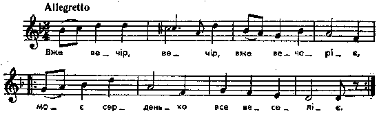 Вже вечір, вечір, вже вечоріє, моє серденько все веселіє. [Останні два рядки кожної строфи повторюються двічі] Сонце низейко, вечір близейко, мойму милому стежка виднейка. Стежка виднейка, іти зблизейка, пущу в садочок, не вчує ненька. Як упускала, ручку стискала, як випускала, з жалю вмлівала. – Іди, мій милий, іди, мій орле... Нащо зійшлись ми? На люте горе! Нащо ж я тебе вірне кохаю? Ми ж розійдемось, як стежки в гаю. . . . . . . . . . . . . . . . . – Є в мене жінка ще й діток двоє, тільки не горнеться серденько моє! Парал. тексти з іншими мелодіями у Балліна, № 40, Роздольський, № 545, і Конощенко, т. 1, № 56. У Конощенка текст дуже близький до нашого, тільки вірш шестискладовий. Строфа, якої тут бракує (сьома, забута Лесею), у Конощенка зложена так: Ой серце-козаче, хрещатий барвінку, признайся по правді, А чи маєш ти жінку. Парал. тексти без нот: Чубинский, т. 5, с. 45, № 103; Милорадович, с. 116, № 16. Місце запису : с.Колодяжне Ковельського повіту Примітки Джерело : Леся Українка. Зібрання творів у 12 тт. – К. : Наукова думка, 1977 р., т. 9, с. 327 – 328. Вперше опубліковано : Народні мелодії. З голосу Лесі Українки. Записав і упорядкував Климент Квітка. – К. : 1918 р., ч. 2, с. 148 – 149. Фольклорні записи Перший | Попередній | Перелік | Наступний | Останній |