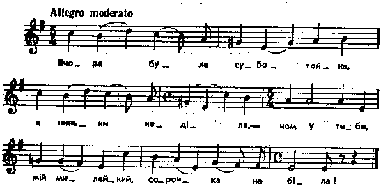 – Вчора була суботойка, а ниньки неділя, – чом у тебе, мій милейкий, сорочка не біла? – Ой як вона буде біла, – вже третя неділя. Мати стара нездужава, сестра не схотіла. – Перебреду бистру річку, стану на пісочку, ой виперу, вимахаю милому сорочку. – Годі тобі, моя мила, сорочечки прати, бери серпа, іди в поле пшеничейки жати. – Не жала я в свого батька і в тебе не буду. Збудуй мені коршомойку, шинкувати буду. – Бодай-бо ти, моя мила, того не діждала, ой щоб моя господиня в шинку шинкувала. Подібна ритмічна схема у Kolberg. Wolyn, № 287 (там же під № 387 варіант до 1 і 3 строф з мелодією, подібною до № 89 нашого збірника), і у Лисенка, VII, № 37; здалека нагадує і Демуцький, № 38. Місце запису : с.Колодяжне Ковельського повіту Примітки Джерело : Леся Українка. Зібрання творів у 12 тт. – К. : Наукова думка, 1977 р., т. 9, с. 328 – 329. Вперше опубліковано : Народні мелодії. З голосу Лесі Українки. Записав і упорядкував Климент Квітка. – К. : 1918 р., ч. 2, с. 149 – 150. Фольклорні записи Перший | Попередній | Перелік | Наступний | Останній |