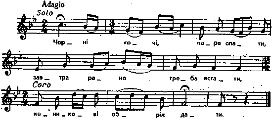Чорні гочі, пора спати, завтра рано треба встати, коникові обрік дати. Коникові обрік дати, (2) до дівчини поїхати. Як приїхав під ворота, (2) вийшла дівча, краща злота. Як приїхав під віконце, (2) вийшло дівча – от як сонце. Взяла коня за гнуздечку, (2) а козака за ручечку. Веде коня у стаєнку, (2) а козака – у світьолку. Дала коню вівса-сіна, (2) козакові – меду-вина. Сама сіла конець стола, (2) до козака – аж ні слова. – Чого мила посмутніла – чи жаль коню вівса-сіна, чи козаку меду-вина? – Не жаль коню вівса-сіна (2) ні козаку меду-вина, тільки жаль мні молодості, (2) що не живем по щирості. Споріднена мел.: Kolberg. Wolyn, № 281. Парал. тексти з іншими мел. – ibid., № 251 і 252; без нот: Колесса. Ходовичі, с. 285, № 31-б і в; Бессараба. Херсон, № 318 і 319; Метлинский, 74-76; Головацкий, т. 3, ч. 1, ст. 49; Чубинский, т. 5, с. 41, 545. Місце запису : с.Колодяжне Ковельського повіту Примітки Джерело : Леся Українка. Зібрання творів у 12 тт. – К. : Наукова думка, 1977 р., т. 9, с. 329 – 330. Вперше опубліковано : Народні мелодії. З голосу Лесі Українки. Записав і упорядкував Климент Квітка. – К. : 1918 р., ч. 2, с. 150. Повний текст пісні записаний рукою Ольги Кривинюк з поміткою: «Колодяжне, од Варки» (див. стор. 28 – 30 рукописного зошита). Фольклорні записи Перший | Попередній | Перелік | Наступний | Останній |