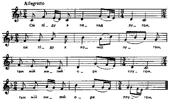 Ой піду я понад лугом, [кожен рядок співається двічі. – ред.] там мій милий оре плугом. Чужа мила поганяє, мені серце умліває. Понесу я йому їсти, чи не скаже мені сісти. Понесу я йому пити, чи не стане говорити. Він наївся, ще й напився, та й на ріллю покотився. – Чого лежиш, чом не ореш, чом до мене не говориш? – Ой я лежу та й думаю, що рудую жінку маю. – Який тобі дідько винен, що ти гарний, чорнобривий, а я руда вродилася, чорнявому судилася. Сватав мене вдень, не вночі, не вилізли тобі очі, сватав мене в білу днину, ізобравши всю родину. Всій родині сподобалась, тобі, дурню, я попалась. Варіанти мелодії: Роздольський, № 382; Конощенко, т. 1, № 11, і т. 3, № 49; Лисенко, VII, № 38. Парал. тексти з іншою мелодією: Бигдай, № 464; без нот: Метлинский, 57; Чубинский, т. 5, с. 199, № 402, с. 1092, № 240; с. 604, № 205; в фельетоні газети «Заря» (російська, виходила в Києві), 1885 p., № 5 – передрукований в «Розвідках Драгоманова про укр. нар. словесність», т. 2, с. 184; Rokossowska, 198; Nejman, № 297; Сакович, с. 141, № 9; Довнар-Запольский, № 487; Эварницкий, № 344 і 345; Бессараба. Седлец, с. 105; Бессараба. Херсон, № 382 і 383; Гнедич, № 667. Близький текст з іншою мелодією: А. Роговскі. Бєларускі песеннік. Вільна, 1911, № 7. Місце запису : с.Колодяжне Ковельського повіту Примітки Джерело : Леся Українка. Зібрання творів у 12 тт. – К. : Наукова думка, 1977 р., т. 9, с. 335 – 336. Вперше опубліковано : Народні мелодії. З голосу Лесі Українки. Записав і упорядкував Климент Квітка. – К. : 1918 р., ч. 2, с. 155 – 156. Фольклорні записи Перший | Попередній | Перелік | Наступний | Останній |
