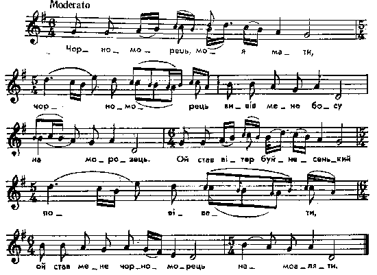 Чорноморець, моя мати, чорноморець вивів мене босу на морозець. Ой став вітер буйнесенький повівати, ой став мене чорноморець намовляти. – Ходи, ходи, дівчинонько, ходи з нами, дамо тобі серм’яжину іа стрічками, дамо тобі ще й віночок із квітками, дамо тобі черевички з підківками. Дурна була, моя мамцю, послухала, сіла з чорноморцем, поїхала. Я ж думала, моя мамцю, панувати, а тепера довелося горювати. Повніший текст і подібна мелодія в Nejman. Паралелі без нот: Метлинский, 237; Чубинский, т. 5, с. 70, № 151, с. 339, № 664. Місце запису : с.Колодяжне Ковельського повіту Примітки Джерело : Леся Українка. Зібрання творів у 12 тт. – К. : Наукова думка, 1977 р., т. 9, с. 337 – 338. Вперше опубліковано : Народні мелодії. З голосу Лесі Українки. Записав і упорядкував Климент Квітка. – К. : 1918 р., ч. 2, с. 158. Фольклорні записи Перший | Попередній | Перелік | Наступний | Останній |