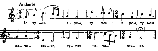 Та туман яром, туман яром, туман качається. (2) Ой чую ж бо я через люди, – вражий син сміється. (2) – Та чому, дівко, жита не жала? – В недузі лежала. (2) – Та чому, дівко, снопи малії? – Бо тісно в’язали. (2) – Та чому, дівко, копи низькії? – Бо в долині клала. (2) – Та чому, дівко, хата не біла? – Видно, дубовая. (2) – Та чому, дівко, заміж не вийшла ? – Видно, убогая. (2) Ой хоча ж бо я убогая, возьмуть мене люде, (2) а вже ж тобі, вражий козаче, пароньки не буде. (2) Там за селом, талі за селом цигани стояли, (2) поміж тими та циганами циганка-воріжка, (2) а до теї та циганочки битая доріжка. (2) Ой до теї циганочки дівчина ходила, (2) вона ж тую циганочку вірнейко просила: (2) – Ой циганочко-воріжейко, вчини мою волю, (2) ізчаруй того козачейка, хай гине за мною. (2) Ізчаруй йому руки й ноги, ще й карії очі, (2) щоб не ходив до іншої темнейкої ночі. (2) Ой циганочка-воріжейка волейку вволила (2) та урізала русої коси, козака підкурила. (2) Варіант мелодії: Kolberg. Wolyn, № 257. Інша мелодія в варіантах: Маркевич А., № 24; Рубець. Сборник украинских песен. – СПб. : 1870 г., вып. 2, № 1; Рубец100, № 21; Лисенко, II, № 19; VIII хор., № 7; Сокальский. Русская народная музыка, с. 163. Парал. тексти без нот: Метлинский, 87, 88; Гильтебрандт, 25 (Кобринськ. пов.), 133 (Берестейського пов.); Nejman, № 168; Эварницкий, № 273; Чубинский, т. 5, с. 418, № 806. Місце запису : с.Колодяжне Ковельського повіту Примітки Джерело : Леся Українка. Зібрання творів у 12 тт. – К. : Наукова думка, 1977 р., т. 9, с. 339 – 340. Вперше опубліковано : Народні мелодії. З голосу Лесі Українки. Записав і упорядкував Климент Квітка. – К. : 1918 р., ч. 2, с. 160. Фольклорні записи Перший | Попередній | Перелік | Наступний | Останній |