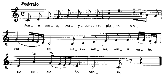 – Мати моя, матусенько, рідна моя мати, навчи мене, моя мати, як нелюба звати. – Ой сядь, ой сядь, моя доню, гей там поза столом, назви свого нелюбонька сивеньким соколом. – Ліпше мені, моя мати, гіркий полин їсти, ніж край того нелюбонька поза столом сісти. Легше мені, моя мати, каміння здіймати, аніж того нелюбонька соколом назвати. Легше мені, моя мати, бистрий Дунай брести, ніж на того нелюбонька оченьками звести. Бистру річку перепливу, – сяду, одпочину; з невірною дружиною без пори загину. Паралелі: з іншою мелодією – Лисенко, VII, № 8; без нот: Метлинский, с. 259, і в оповіданні Ганни Барвінок «Перемогла» (с. 232 по виданні її оповідань 1902 року, Київ). Місце запису : Любомль Володимирського повіту Примітки Джерело : Леся Українка. Зібрання творів у 12 тт. – К. : Наукова думка, 1977 р., т. 9, с. 347 – 348. Вперше опубліковано : Народні мелодії. З голосу Лесі Українки. Записав і упорядкував Климент Квітка. – К. : 1918 р., ч. 2, с. 167 – 168. Збереглося два автографи тексту цієї пісні в запису Лесі Українки. Один з них (Державший центральний музей музичної культури ім. М. І. Глінки в Москві, ф. 275, інв. № 70, арк. 22 зв. – 23) опублікував К. Квітка разом з мелодією. Другий (там же, ф. 275, інв. № 70, арк. 1) має незначні текстові відміни. Фольклорні записи Перший | Попередній | Перелік | Наступний | Останній |