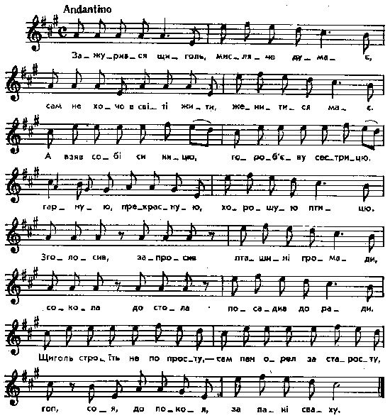 Зажурився щиголь, мисляче думає, сам не хоче в світі жити, женитися має. А взяв собі синицю, гороб’єву сестрицю, гарную, прекрасную, хорошую птицю. Зголосив, запросив пташині громади, сокола до стола посадив до ради. Щиголь строїть не попросту, – сам пан орел за старосту, гоп, соя, до покоя, за пані сваху. Збираються збори в хаті на помості, і дружечки, і світилки – весільнії гості. Зозуленька й чечітки, синичині тіточки, всі ж вони приданками, несуть подарочки. Журавлі на кулі сватами засіли, а шпаки й кулики за бояри сіли. Сова їде каритою, каня іде піхотою, шпак скаче, куди баче, усі за гостей. А ворони-жони коровай місили, а сороки білобокі шишечки ліпили, горобчики-молодці для сестриці-синиці мед-вино доношають, ставлять на стільниці. Загув бас, таламбас, скрипочки заграли, і старе, й молоде – танця витинали, зозуленьку взяв деркачик, пані чаплю взяв бугайчик, гоп, скоки! Руки в боки, гуляй, веселись. Де не взявся шуляк, з-під неба, з-під хмари, ухопив він синиченьку з коханої пари! Ой рятуйте синицю, гороб’єву сестрицю, гарную, прекрасную, хорошую птицю! І гукав, і шукав щиголь нещасливий, не знайшов та й пішов, – боже милостивий! Заходився, одружився, на весілля утратився, ой гоя, доля моя, дружини ж нема! Від Л. У. записано 1-й куплет, останні ж подала О. Пчілка. Пісня пішла від лужицьких сербів; оригінал зложив у 18 віці один рільник із Правочиць (Adolf Czerny. Svatba u Lužickych Srbů. V Praze, 1893, Ptači kwas). Українські варіанти: з іншими мелодіями – Записки юго-западного отд. импер. русск. геогр. о-ва, т. 1. К., 1874, с. 22 нотного додатку (від кобзаря Остапа Вересая); Лисенко, VII, № 42; Роздольський, № 1325; А. Кошиць. Зб. у. пісень для хору. – К. : 1912 р., т. 2, № 10. Без нот: Waclaw z Oleska, s. 476, № 6; Головацкий, т. 2, с. 550, № 4; т. 3, ч. 1, с. 496, № 2; Чубинский, т. 5, с. 1124, № 66 (пор. с. 1144-1145, № 131 і 132); Brykczynski, s. 110, № 6; В. Храневич. Шуточная нар. песня. – «Киевская старина», 1894, № 7, с. 111 – 115; Эварницкий, № 807 – 808. Початок 3-го куплета – див. оповідання Ганни Барвінок «Сирітський жаль» (с. 47 по виданні її оповідань 1902 року, Київ). Місце запису : Любомль Примітки Джерело : Леся Українка. Зібрання творів у 12 тт. – К. : Наукова думка, 1977 р., т. 9, с. 355 – 357. Вперше опубліковано : Народні мелодії. З голосу Лесі Українки. Записав і упорядкував Климент Квітка. – К. : 1918 р., ч. 2, с. 176 – 178. Фольклорні записи Перший | Попередній | Перелік | Наступний | Останній |