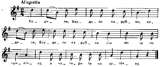 Xoдили, блудили парубки, ходили, блудили парубки сім літ та по припічку, а чотири та по запічку. Пар. тексти без нот: Чубинский, т. 3, с. 37, № 83 (поміж весняними грами); т. 5, с. 1123, № 65 (повніший); Rokossowska, s. 213, № 82. Місце запису : Колодяжне Примітки Джерело : Леся Українка. Зібрання творів у 12 тт. – К. : Наукова думка, 1977 р., т. 9, с. 365. Вперше опубліковано : Народні мелодії. З голосу Лесі Українки. Записав і упорядкував Климент Квітка. – К. : 1918 р., ч. 2, с. 186. Фольклорні записи Перший | Попередній | Перелік | Наступний | Останній |
